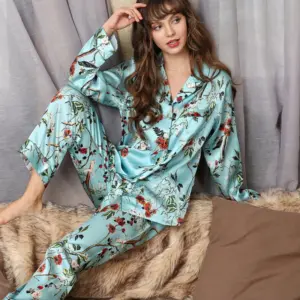 Women Autumn Winter Silk Pajamas Set Casual Soft Breathable and Relaxed Fit Long Shirt Tops and Long Pants Sleepwear